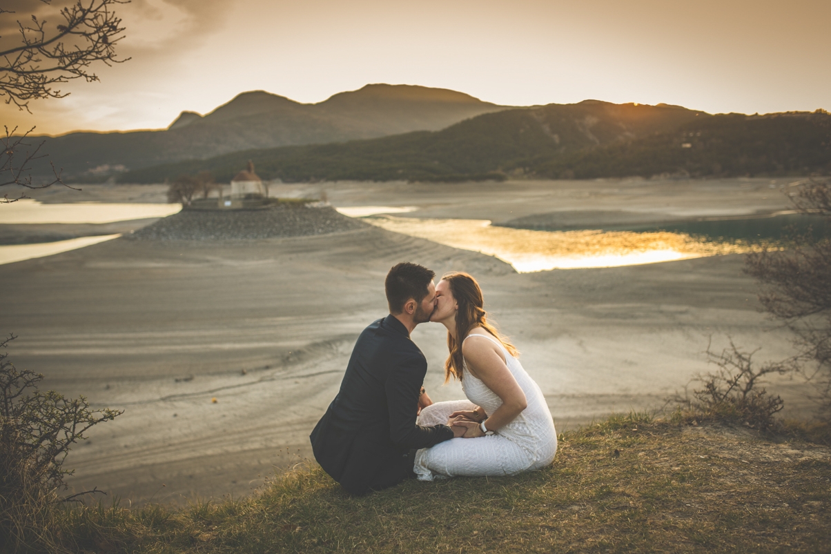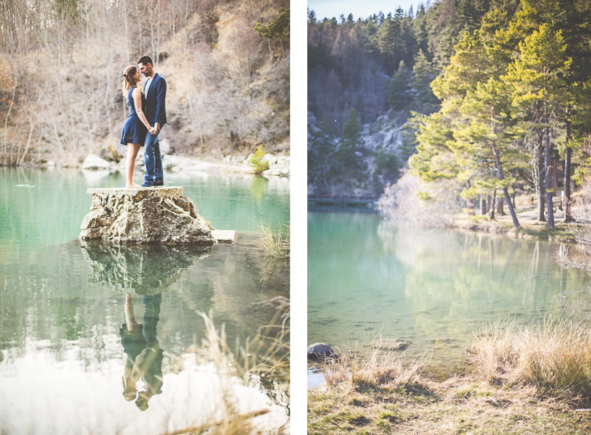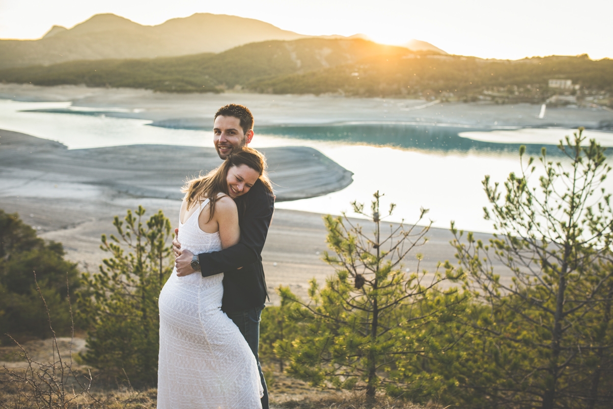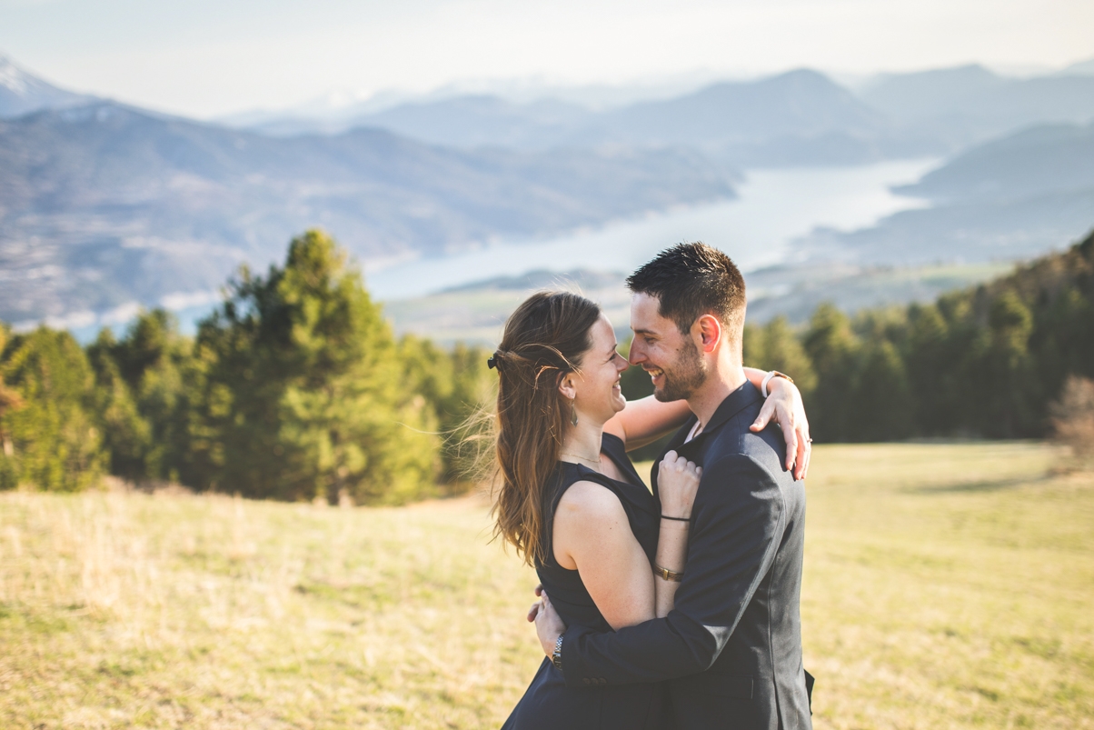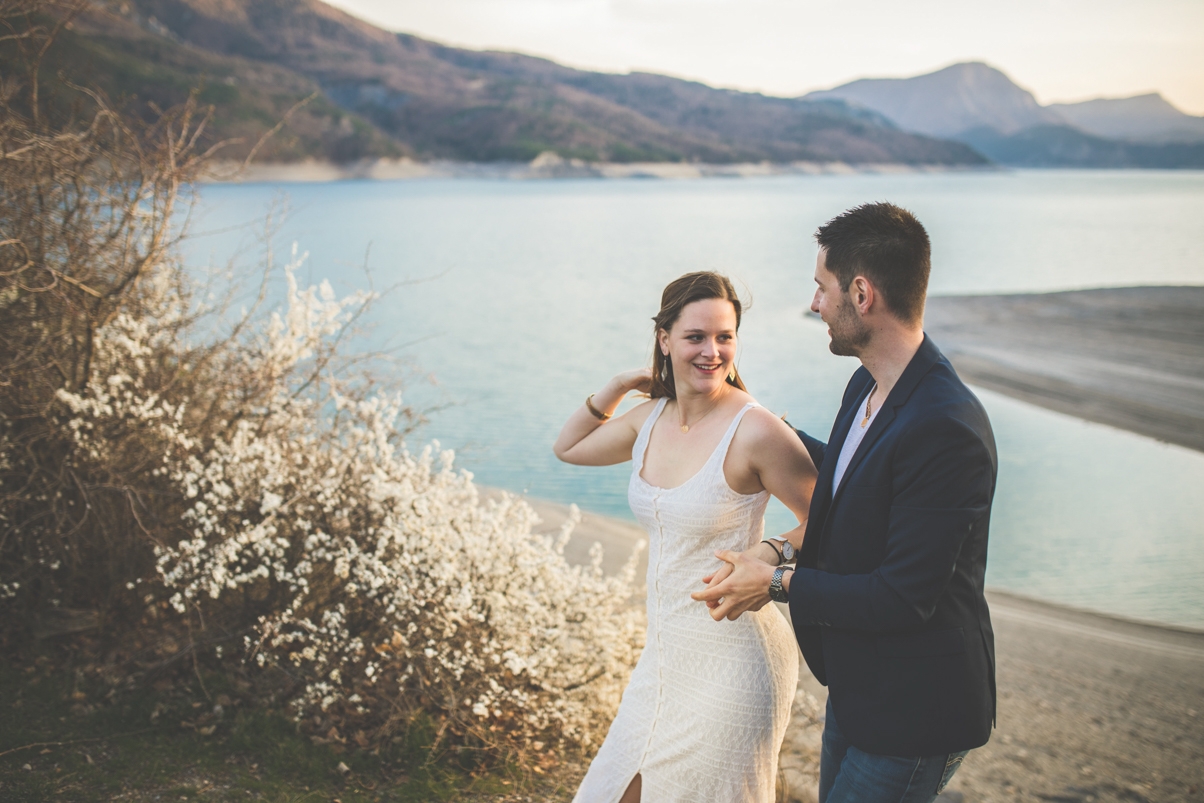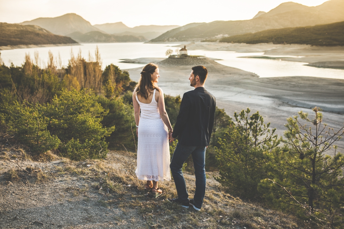 Ils vivent aujourd’hui à Gap, il m’est alors apparu comme une évidence de leur proposer de réaliser leur séance engagement dans ce studio un peu différent ! Nous avons choisi de prendre un peu de hauteur au lac de Saint-Apollinaire. A environ de 1350 mètres d’altitude. Nous avons terminé la séance autour du lac de Serre-ponçons. Malgré le fait qu’il soit très bas en cette saison le décor demeure charmant. En fin de journée, la lumière se fait plus douce encore, un bonheur pour les photographes. L’îlot Saint-Michel (ça ne s’invente pas !) et sa chapelle se détachent du fond du lac. Nous sommes un peu hors du temps autour ce ces symboles des Hautes-Alpes.