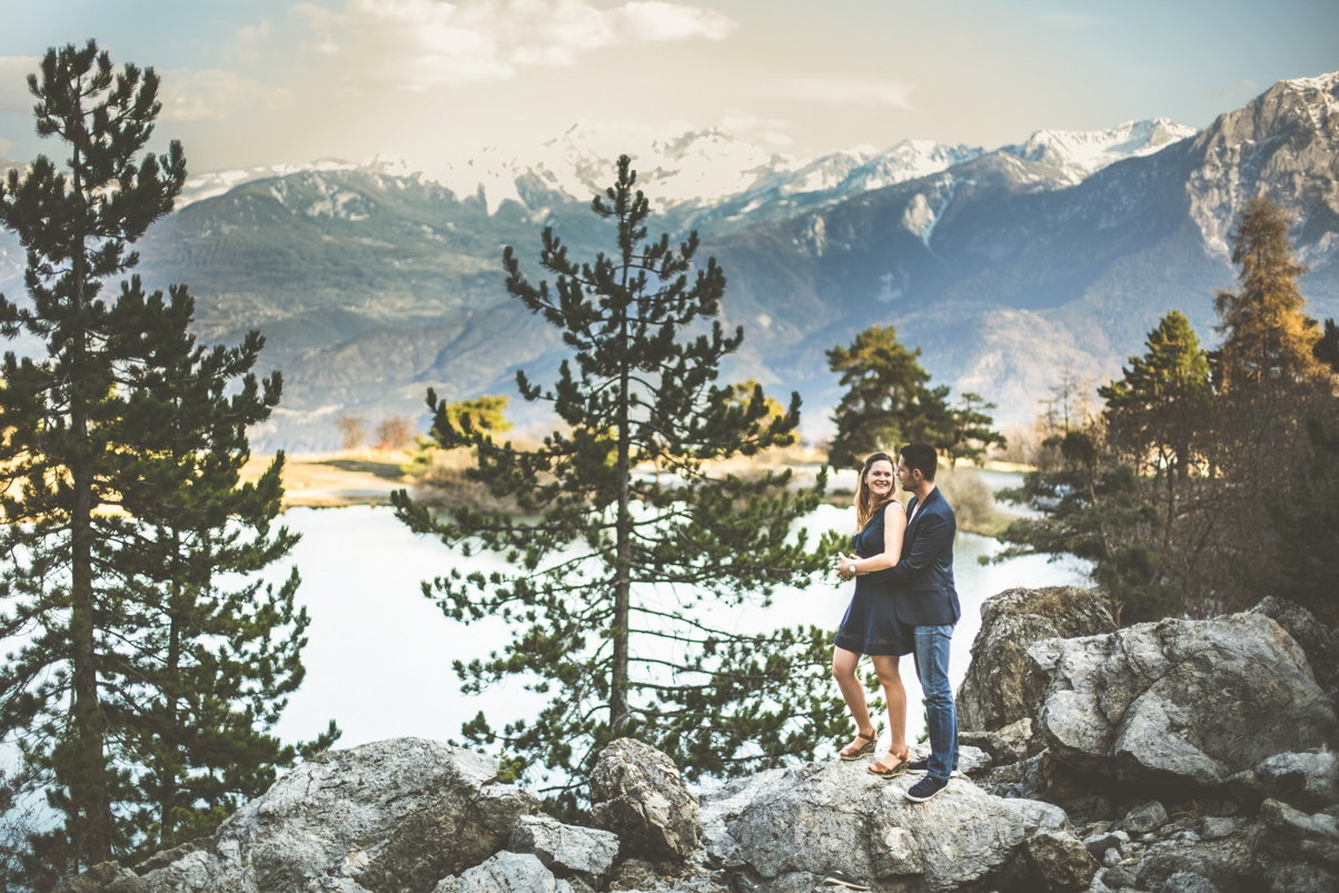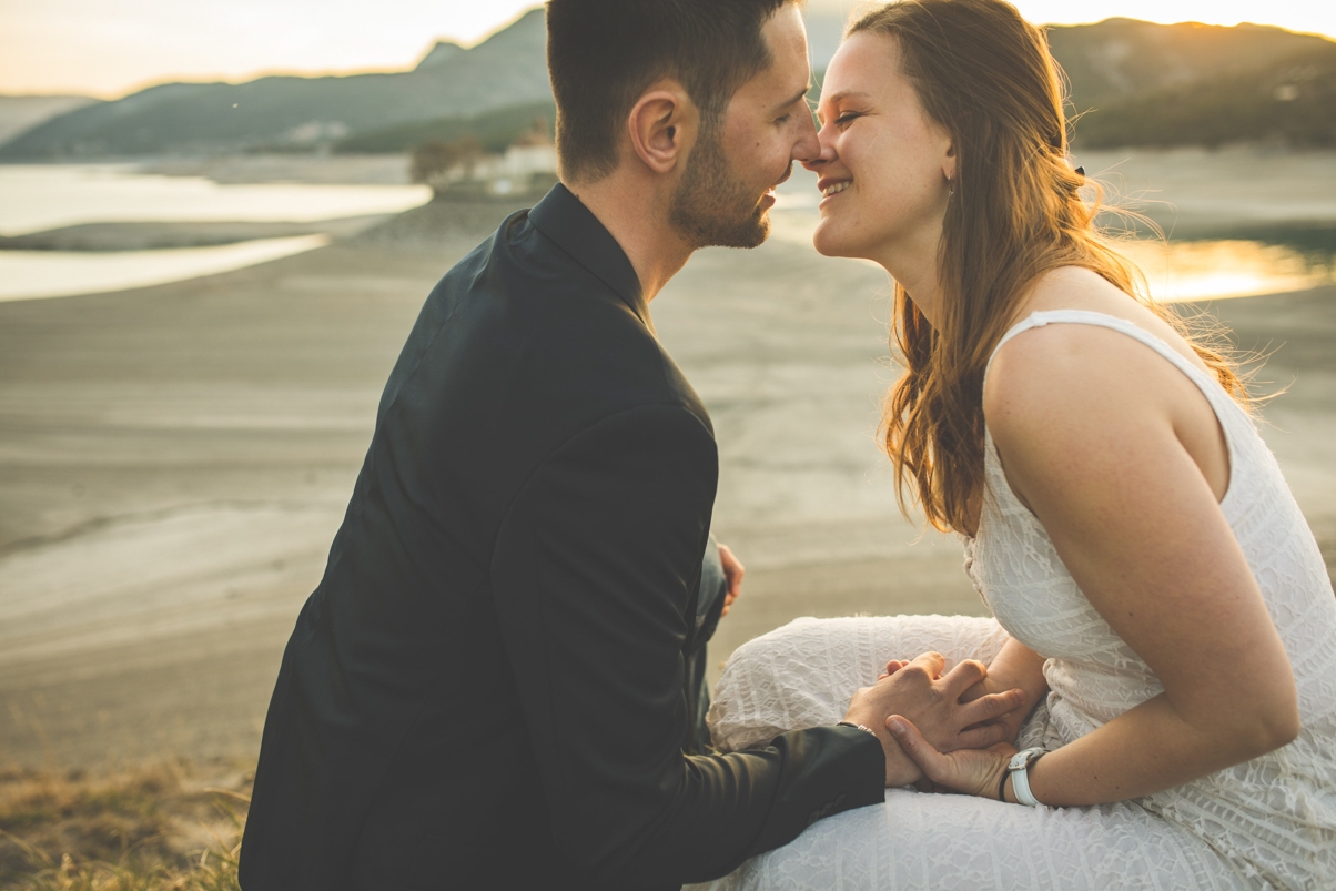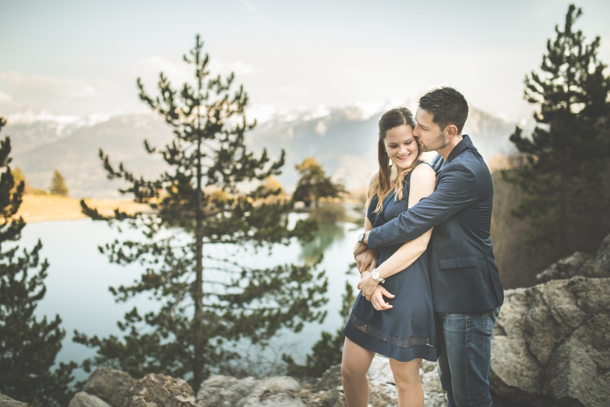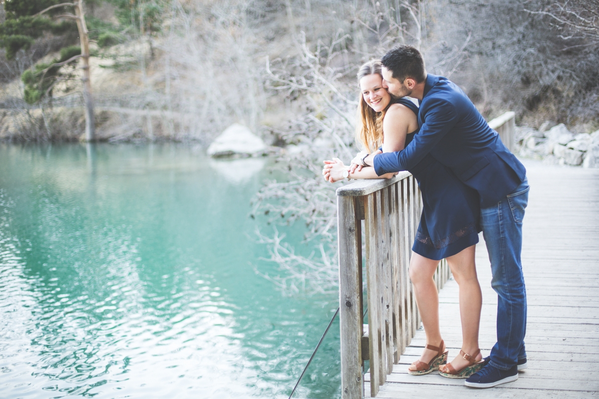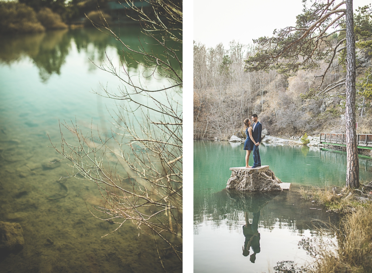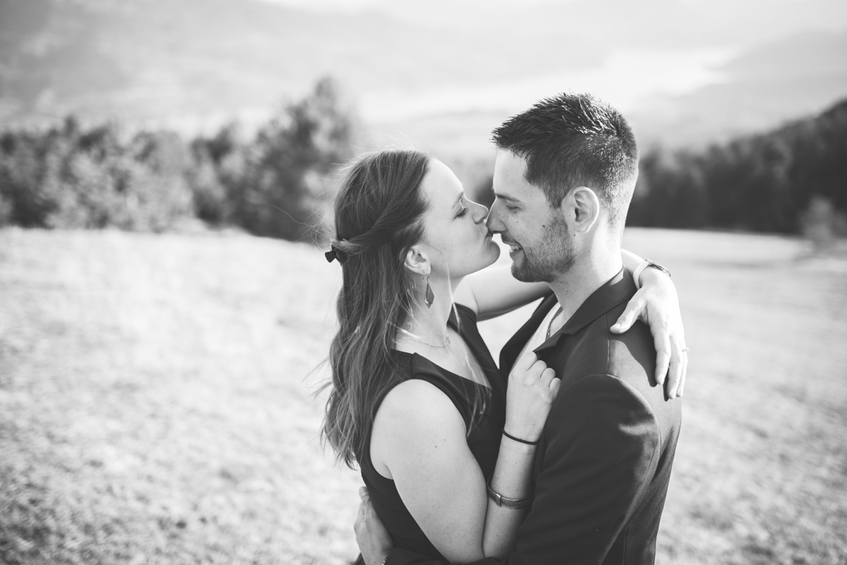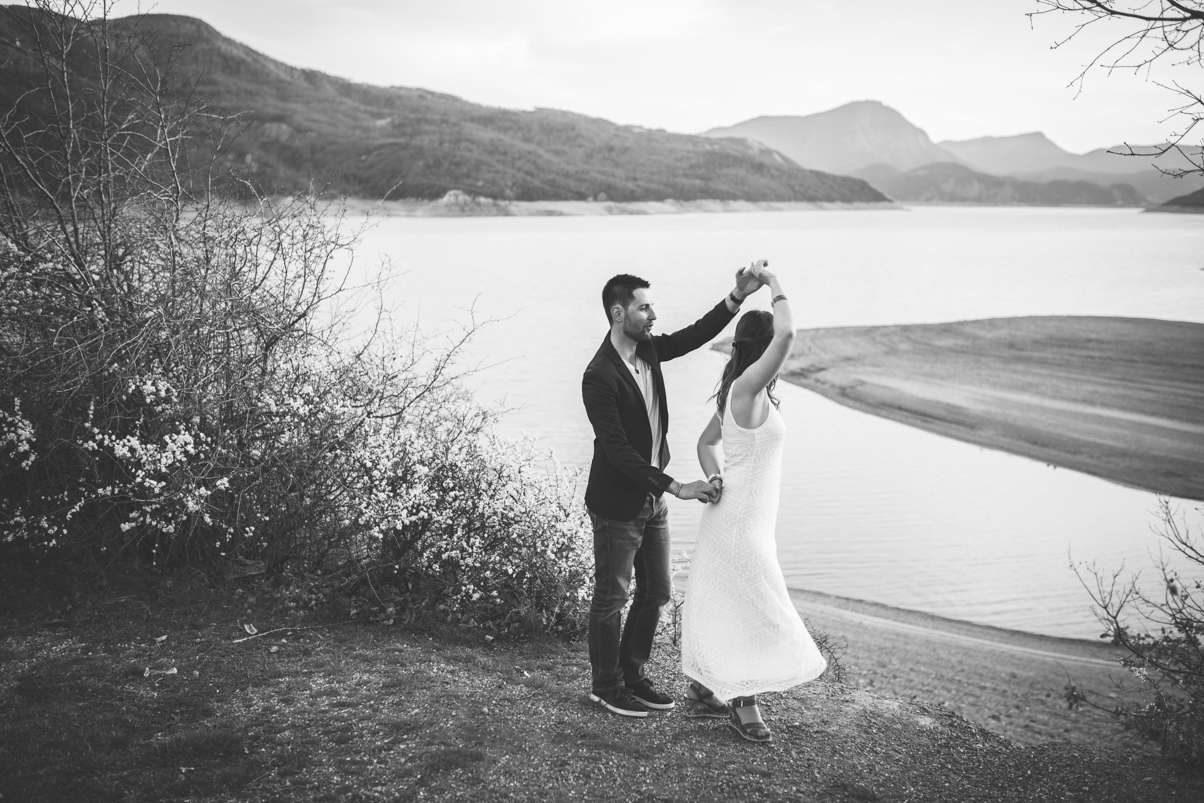 Ils vivent aujourd’hui à Gap, il m’est alors apparu comme une évidence de leur proposer de réaliser leur séance engagement dans ce studio un peu différent ! Nous avons choisi de prendre un peu de hauteur au lac de Saint-Apollinaire. A environ de 1350 mètres d’altitude. Nous avons terminé la séance autour du lac de Serre-ponçons. Malgré le fait qu’il soit très bas en cette saison le décor demeure charmant. En fin de journée, la lumière se fait plus douce encore, un bonheur pour les photographes. L’îlot Saint-Michel (ça ne s’invente pas !) et sa chapelle se détachent du fond du lac. Nous sommes un peu hors du temps autour ce ces symboles des Hautes-Alpes.